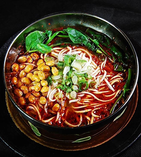 〈皇城老媽〉的〈酸辣粉〉湯是以大骨湯為基底,然後加了酸辣醬熬煮,這醬是用郫縣豆瓣醬為底料,再加了醋、花椒和辣椒粉炒製,煮湯時還得另外在湯裡加了肉末、放宜賓芽菜、榨菜與蒜水,並灑了炒乾的黃豆與蔥花,成菜後一個湯碗裡紅油汪汪,乍看比〈麻辣鍋〉還要「凶猛」,入口卻集麻、辣、酸、香、鮮,油雖油、卻不膩,比起那乾吃、且吃一口就冒汗的〈宜賓燃麵〉可親多了。